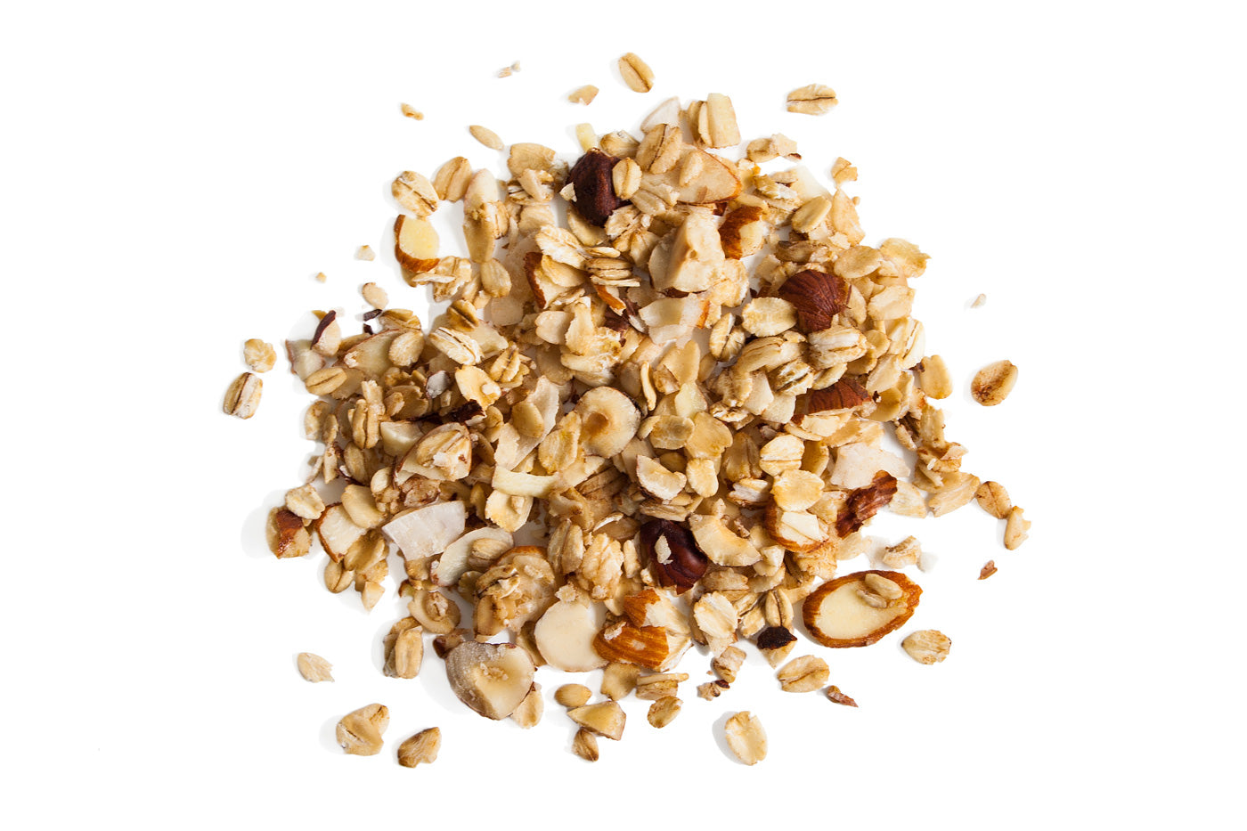 Almendra, coco, avena, amaranto, cacahuate, pepita, linaza, aceite de canola, esencia de vainilla y miel de agave.