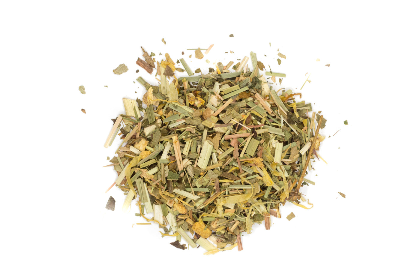 Zacate de limón, jengibre, hojas de zarzamora, hojas de fresa, hojas de avellano, cáscara de limón, ginko, caléndula y saborizante natural de limón.